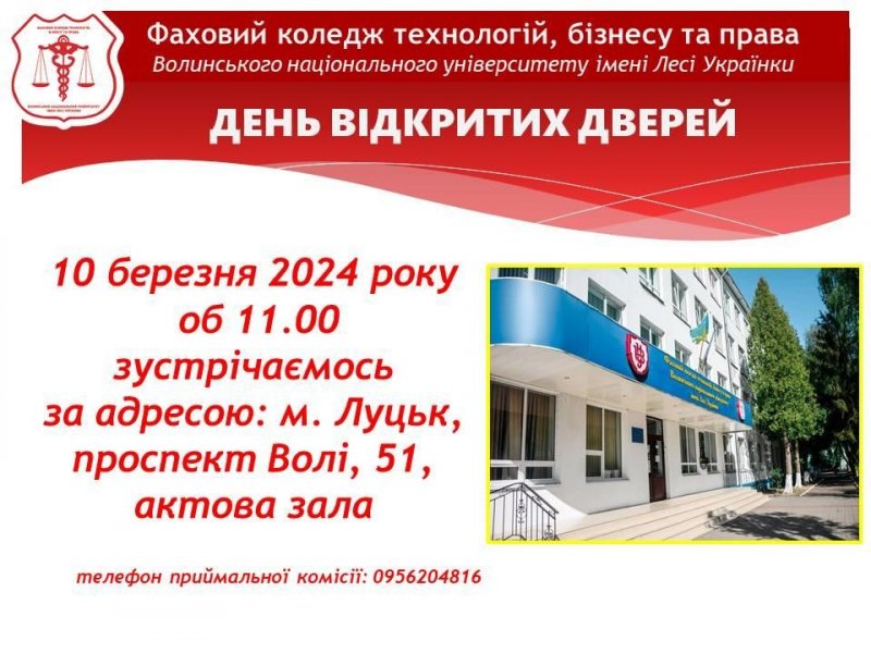 У неділю, 10 березня, у Фаховому коледжі технологій, бізнесу та права Волинського національного університету імені Лесі Українки відбудеться День відкритих дверей.