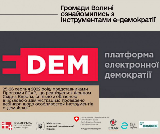 25-26 серпня 2022 року представниками Програми EGAP, що реалізується Фондом Східна Європа, спільно з обласною військовою адміністрацією проведено вебінари щодо особливостей інструментів е-демократії.