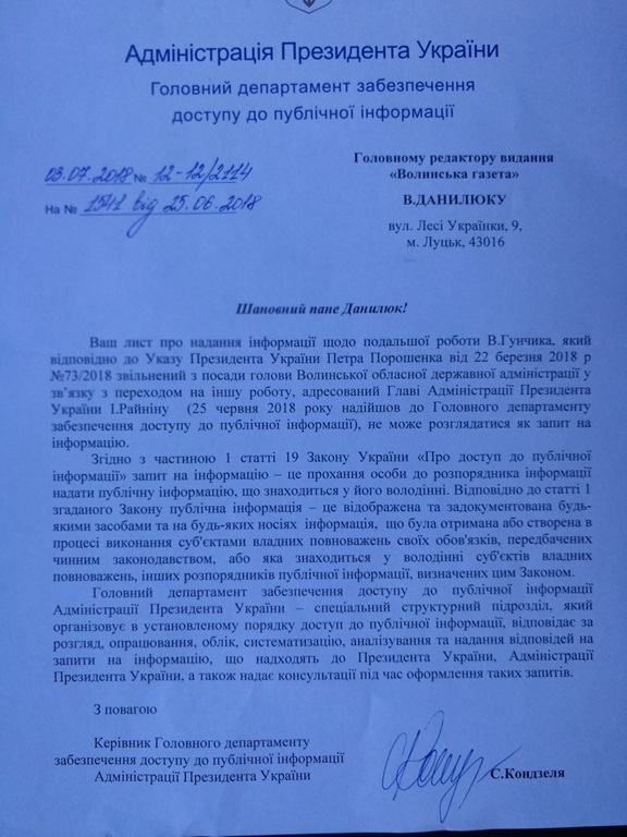 роботу, адресований Главі Адміністрації Президента України Ігорю Райніну (25 червня 2018 р. надійшов до Головного
