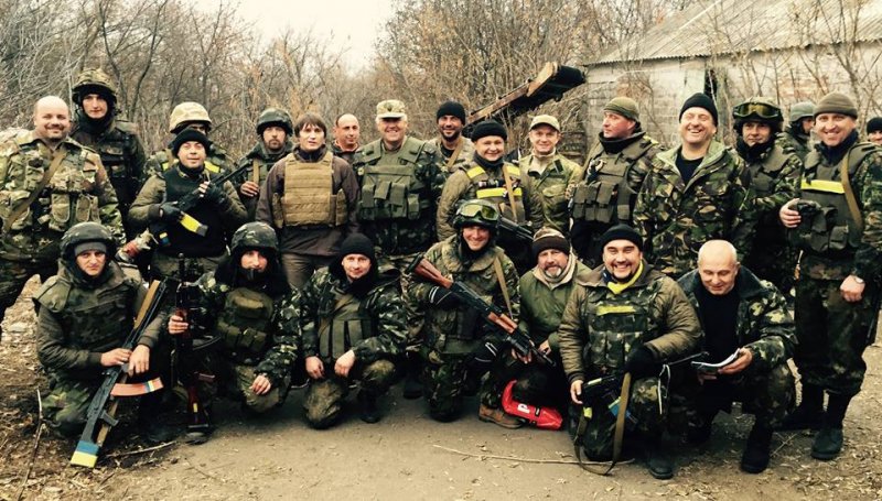 На фото з офіційного інтернет-представництва Ігоря Єремеєва: Ігор Єремеєв серед бійців тербату “Волинь” у Дебальцевому, листопад 2014 р.