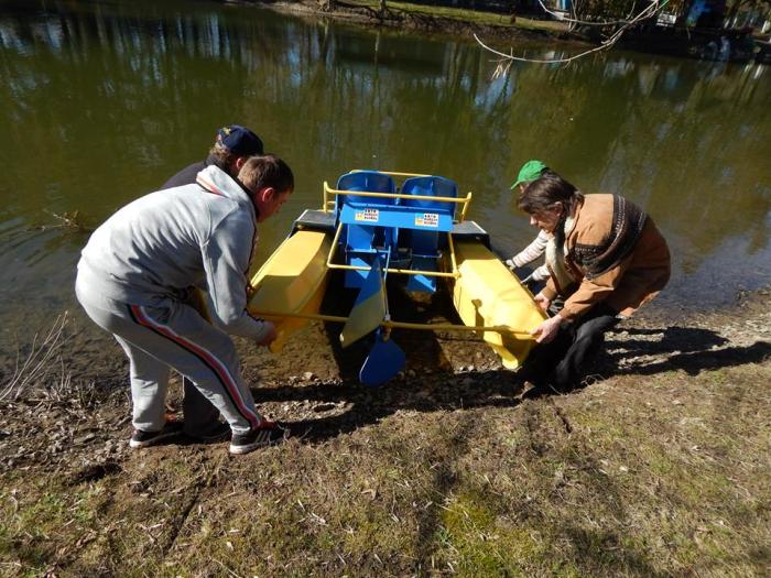 Лучани Володимир Таранюк та Олександр Савчук – обидва представники Автомайдану Волині. Вони й спустили на водойму Луцького зоопарку катамаран, який розібрали і склали заново. Працювали більше тижня – знімали багато шарів фарби, потім знову фарбували, встановили нові сидіння. Усе це – з власної ініціативи, власними силами та коштом.