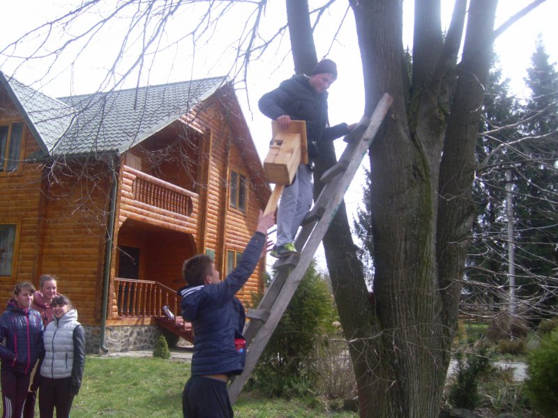 розвісили десяток шпаківень. Птахи, що повернулися з теплих країв, вже обживають