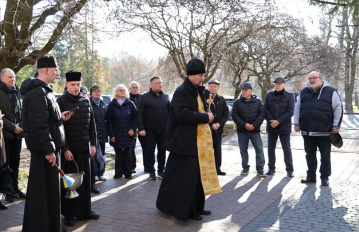 Родина, колеги і друзі Василя Васильовича під час освячення меморіальної таблиці.