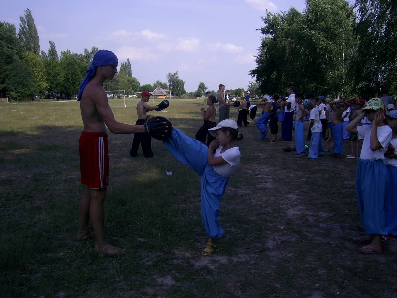 виступ козацьких бойових мистецтв. Біля 60 юнаків і дівчат просто неба двадцять