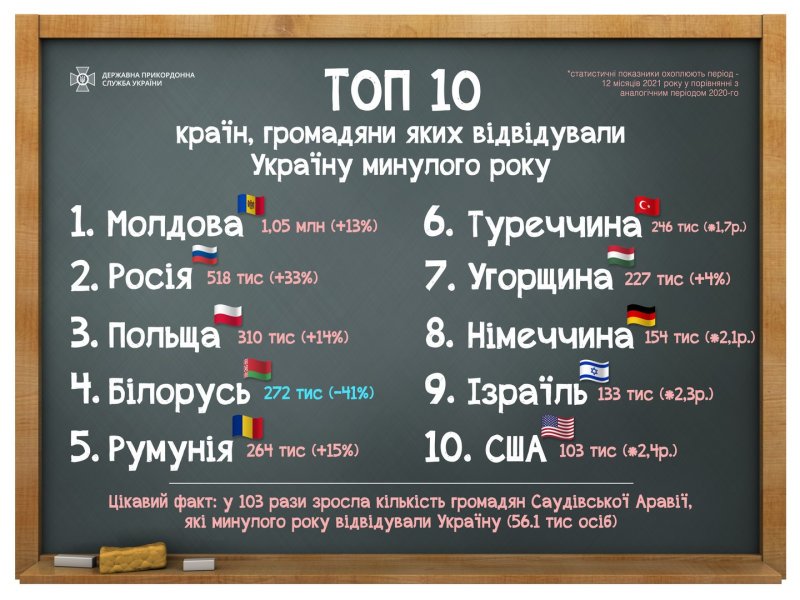 У Державній прикордонній службі України також розповіли про ТОП 10 країн, громадяни яких відвідували нашу країну упродовж минулого року.
