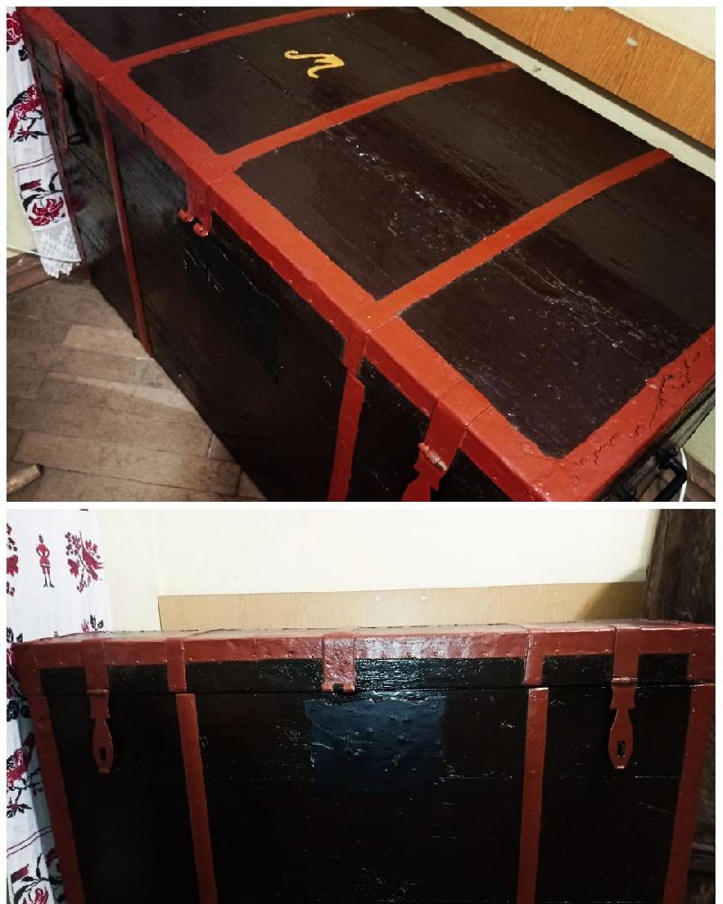 літера). Колись скриня зачинялася на ключ. З боків має металеві ручки для
