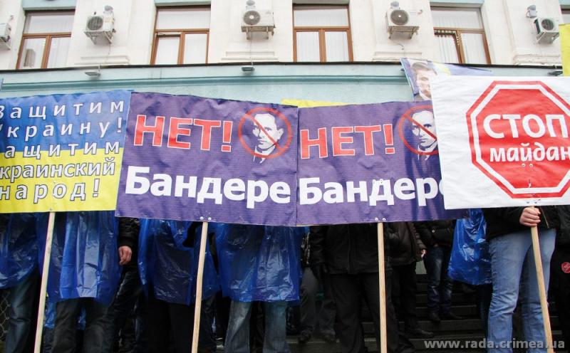 На фото прес-служби «Державної Ради Республіки Крим»: напередодні т. зв. референдуму про входження до складу Росії кримська влада організовувала ось такі мітинги, де персоною нон-грата важався лише покійний Степан Бандера…