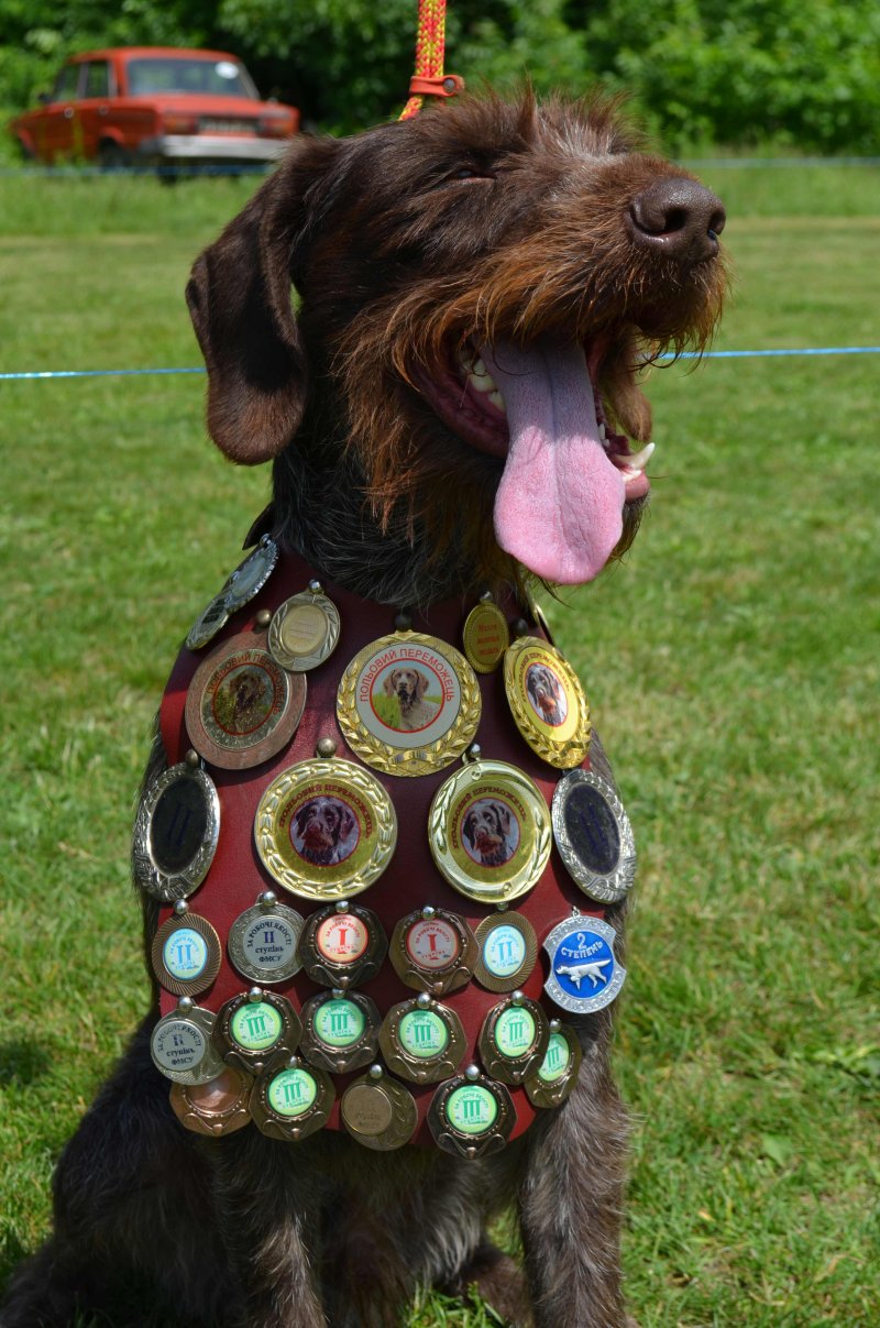 На фото автора: дратхаар Дан Сергія Федюри (Рівне) – п’ятиразовий польовий чемпіон; переможці бесту; ще мить і Ігор Жмурко вручить головний кубок переможцю.