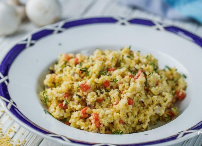 Пшоно (250 г) промиваємо у гарячій воді та пересипаємо його в овочі. Час від часу підливаємо овочевий бульйон. Усього використавши 100-150 мл. Тушкуємо приблизно 15 хвилин на маленькому вогні до стану аль денте.