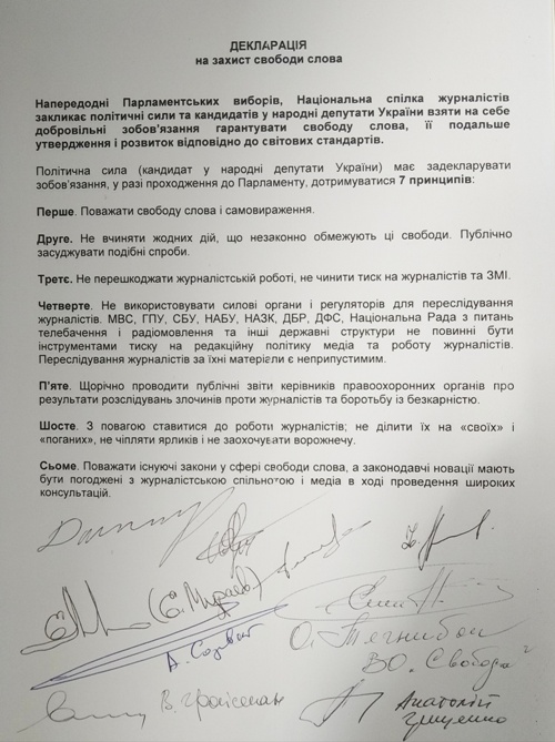 фото прес-служби НСЖУ: Декларація на захист свободи слова з підписами політиків.