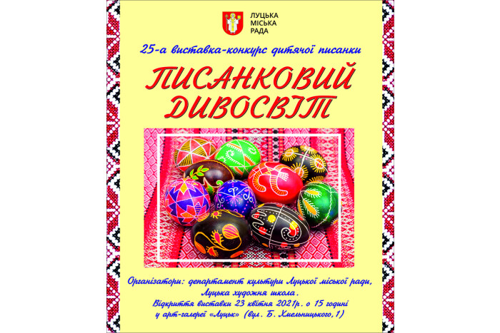 23 квітня у приміщенні арт-галереї «Луцьк» (вул. Богдана Хмельницького, 1) відбудеться відкриття 25-ї виставки дитячої писанки «Писанковий дивосвіт», де представлена 361 писанка 95 учасників однойменного конкурсу, що проходив на базі Луцької художньої школи.