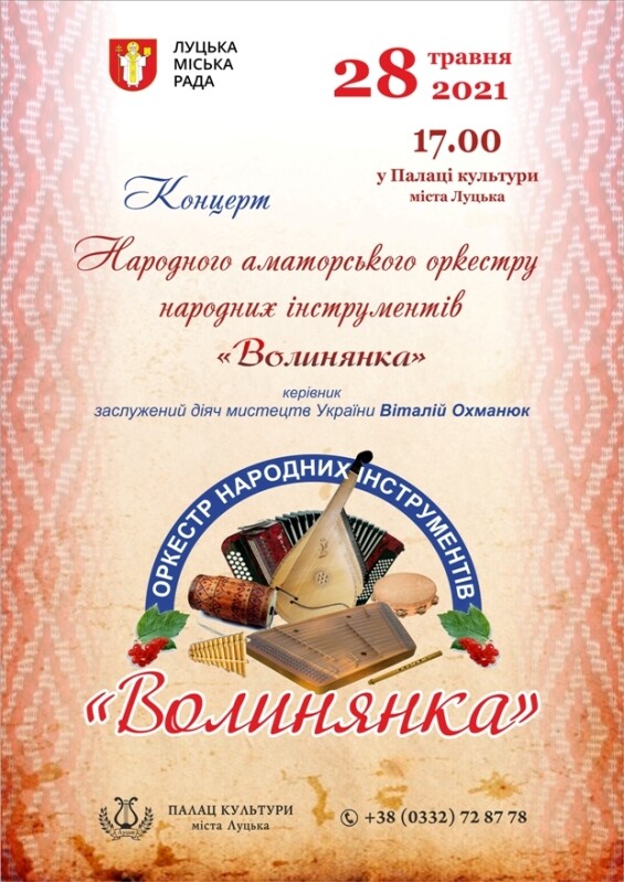 28 травня 2021 року у Палаці культури міста Луцька відбудеться концерт народного аматорського оркестру народних інструментів «Волинянка».