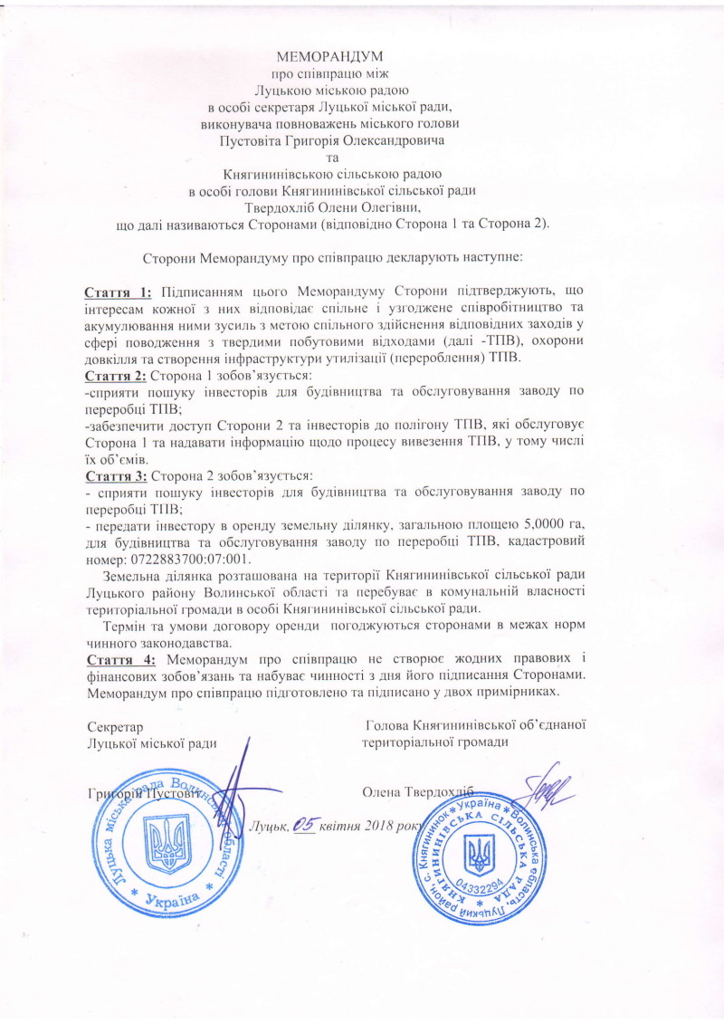 сторонами на пошук інвестора для будівництва заводу по переробці твердих