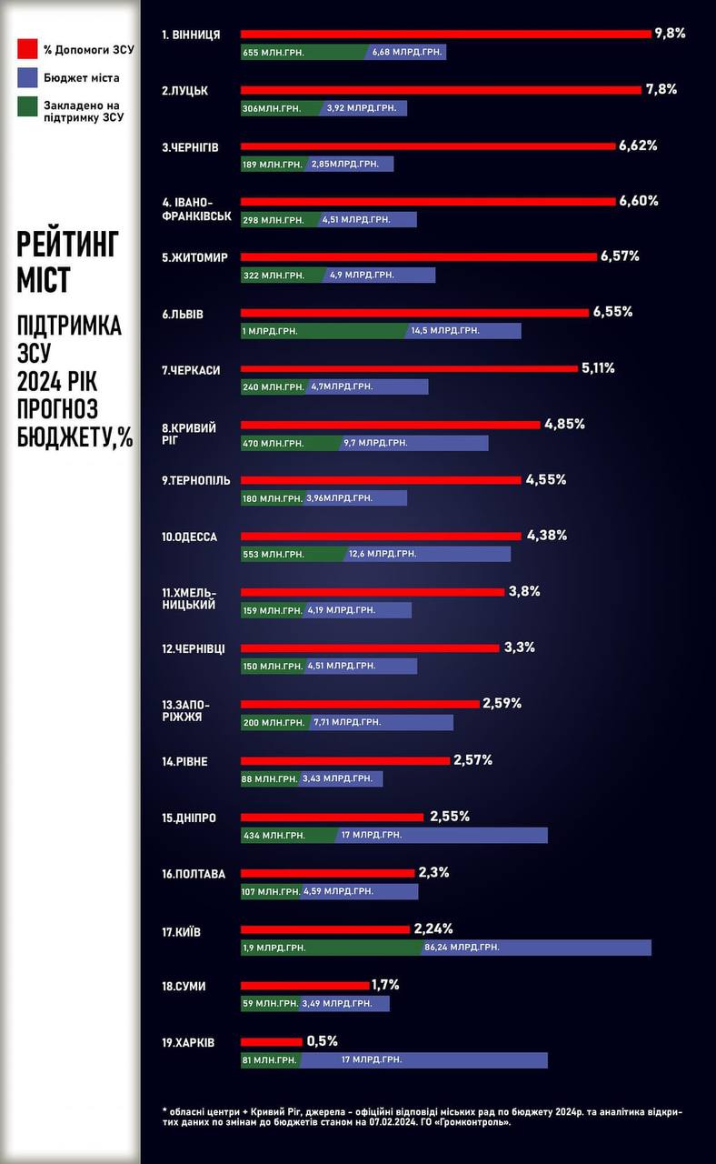 Луцьк зайняв друге місце серед обласних центрів України за коштами, виділеними з бюджету на підтримку ЗСУ у 2024 році (у відсотковому значенні).