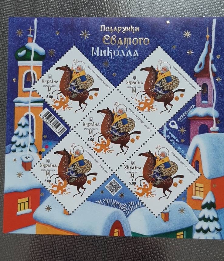 «Автор марки Кость Лавро поєднав новорічні свята, День ЗСУ та мрію українців про перемогу в одній картинці. Тому на новому поштовому випуску Святий Миколай везе в камуфляжному мішку необхідну для перемоги України зброю», – зазначила Валентина Варголяк.