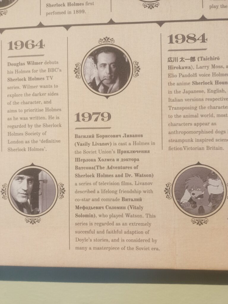 Апогеєм популярності теми став 1979 рік, коли на екрани вийшов телефільм «Пригоди Шерлока Холмса і доктора Ватсона», де головні ролі виконали Васілій Ліванов та Віталій Соломін, а неперевершених власницю квартири місіс Хадсон та поліцейського інспектора Лестрейда відповідно актриса Ріна Зєльоная та киянин Борислав Брондуков.