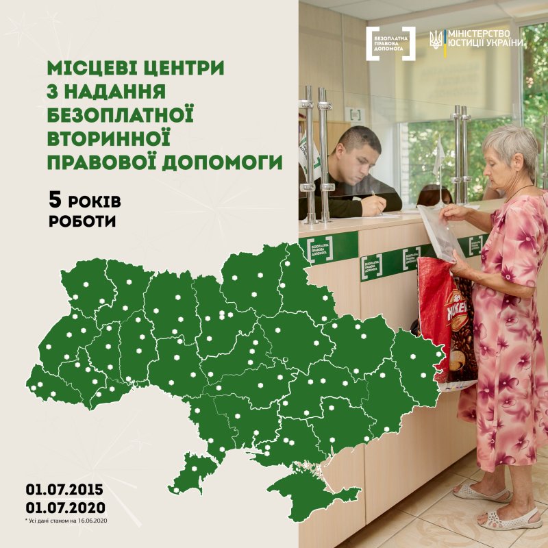 1 липня 2015 року в Україні запрацювали місцеві центри з надання безоплатної вторинної правової допомоги. Це стало черговою сходинкою до розбудови системи безоплатної правової допомоги в країні. За ці п’ять років по правову допомогу звернулися понад 1,6 млн українців. Багато з них, вирішивши одну правову проблему, зверталися до фахівців системи БПД з іншим питанням. Загалом за цей час до місцевих центрів надійшло понад 2,3 млн звернень від клієнтів. Саме ці цифри свідчать про довіру українців до системи БПД.