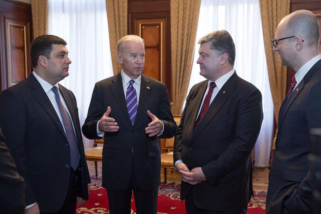 На фото ІА «ВолиньPost» та «Радіо ВВС Україна»: Володимир Гройсмана на Волині восени далекого 2017 року зустрічав тодішній голова облдержадміністрації Володимир Гунчик; Володимир Гройсман, віце-президент США Джо Байден, Петро Порошенко і Арсеній Яценюк.