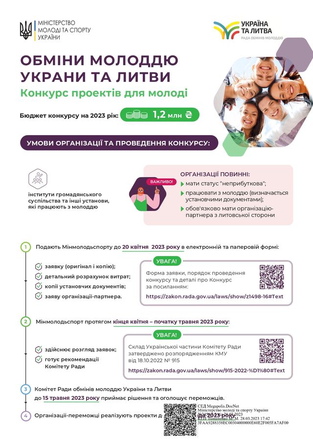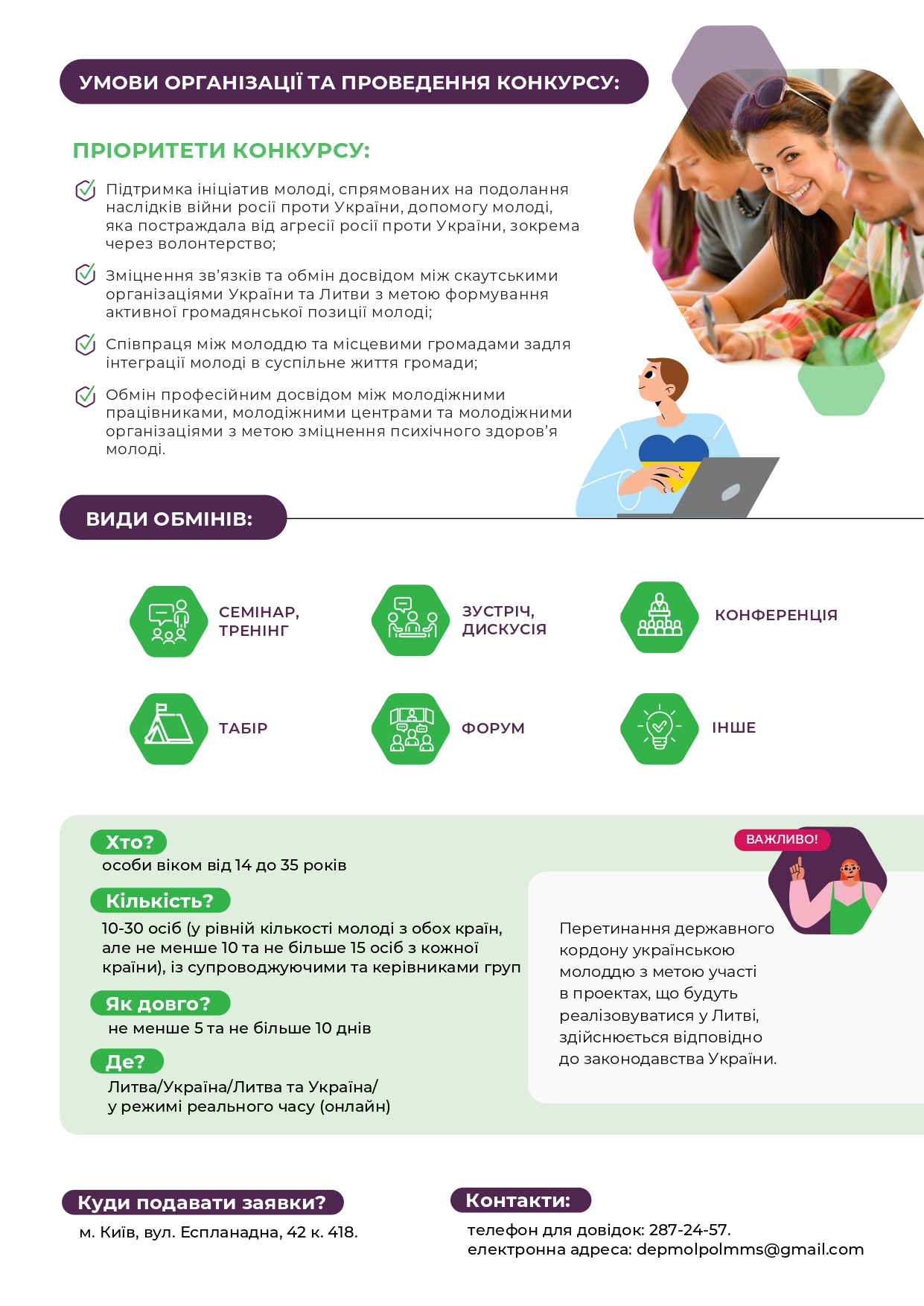Міністерство молоді та спорту України приймає заявки на участь у конкурсі на реалізацію проєктів у рамках здійснення обмінів молоддю України та Литви.