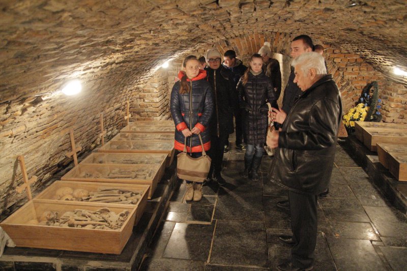 На фото: письменник Андрій Бондарчук зі студентами у підземеллі Хрестовоздвиженського храму, де знаходиться прах Данила Братковського.