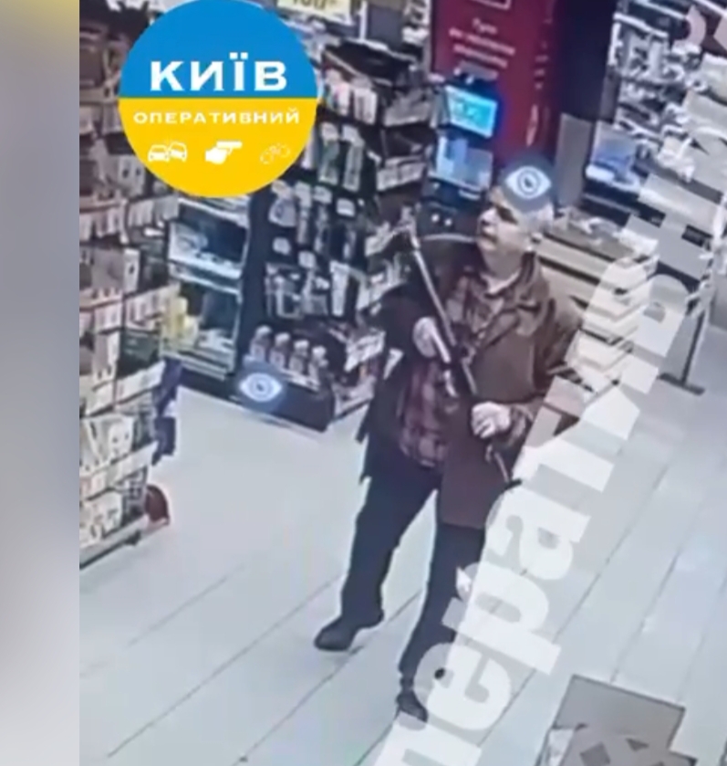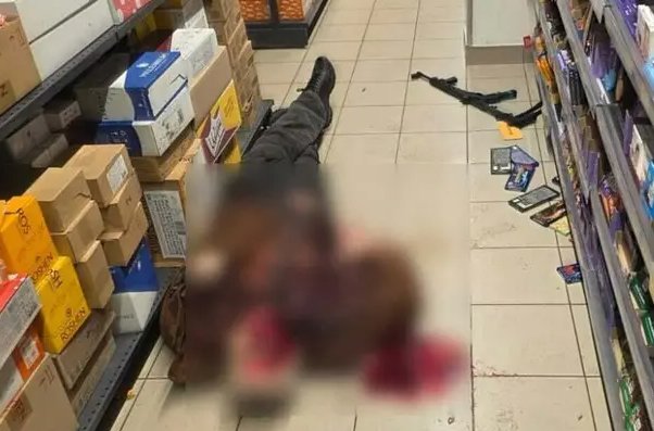 На фото з соцмереж: озброєний злочинець у супермаркеті та його труп і зброя.