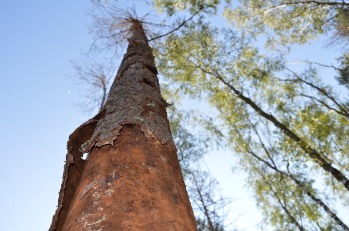 короїдом є зміна кольору хвої. На цьому фотолише 1 дерево є здоровим, решта