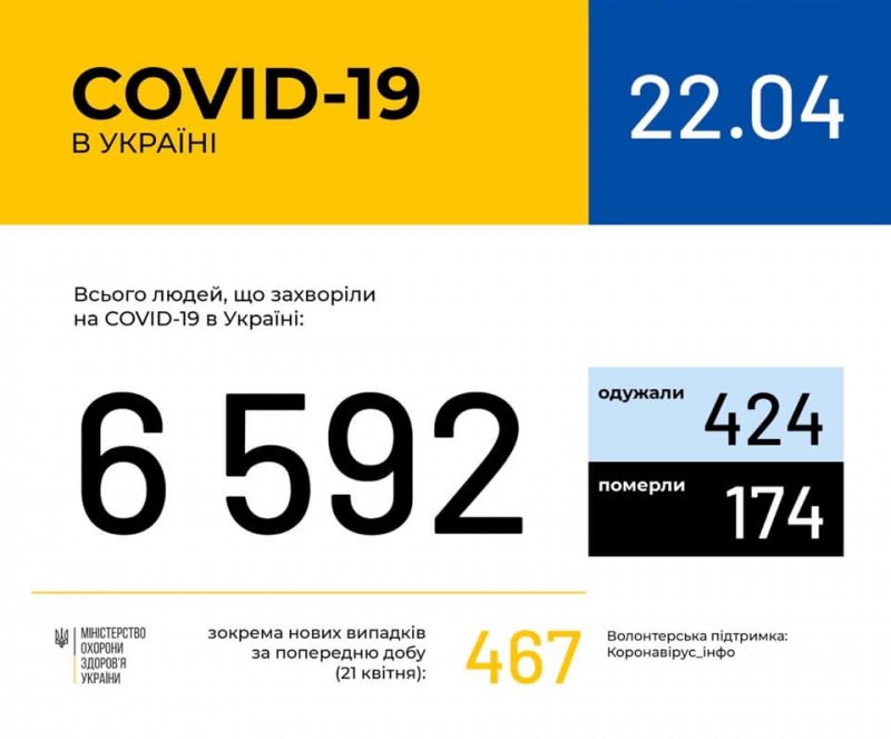 на 9:00 22 квітня в Україні 6592 лабораторно підтверджені випадки COVID-19, з