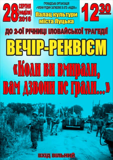 Організатор пошанування Героїв Іловайська – громадська організація «Члени родин загиблих в АТО «Надія», які разом із міськрадою запрошують лучан взяти участь у заходах до другої річниці Іловайської трагедії та разом вшанувати пам’ять земляків, які віддали своє життя, захищаючи територіальну цілісність України.
