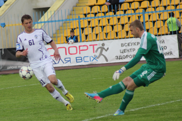 На фото прес-служби ФК «Говерла»: майже пенсіонер Шацьких, який забив перший гол у ворота «нефартового» Неділька.