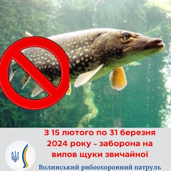 Держрибагентство повідомляє, що з 15 лютого відповідно до Правил любительського рибальства, у всіх рибогосподарських водних об’єктах (їх частинах) встановлюється заборона на добування (вилов) щуки на період нересту, яка діятиме до 31 березня.