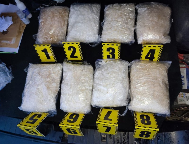 Під час обшуку в транспортному засобі виявили й вилучили понад 8 кілограмів психотропної речовини “Альфа PVP”, канабіс, грошові кошти, банківські картки, мобільні телефони. 43-річний організатор наркобізнесу намагався заховати заборонені речовини навіть під капотом автомобіля.