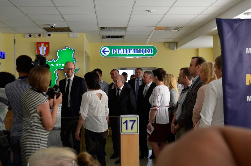 Усі разом урядовці вирушили до луцького Центру з надання адміністративних послуг, збудованого на руїнах старого Будинку побуту, що уособлював собою химерні реалії тоталітаризму. Про колишніх ворогів народу найвищих рангів, які відкривали цю установу та неодноразово тут бували, вже, на щастя, нічого не нагадує. Тому привезений із Києва банер і став якнайкращою окрасою як завжди змістовного виступу тов. Яценюка А. П. та окремих, особливо перевірених товаришів.