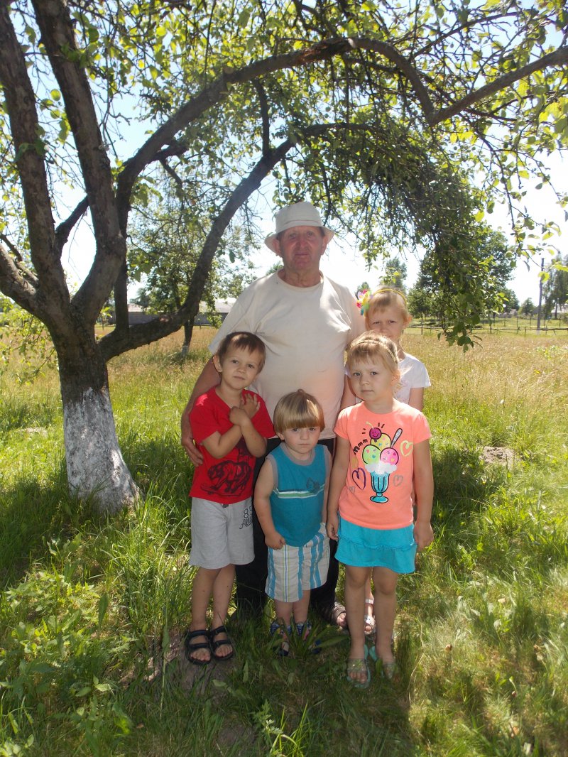 На фото автора: Степан Андрусик з онуками під яблунею в рідному будківському садку.