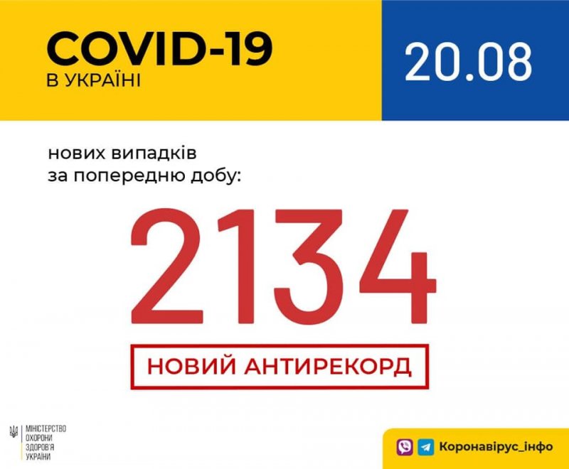 В Україні зафіксовано 2134 нові випадки коронавірусної хвороби COVID-19 — це антирекорд з кількості нових хворих за добу.