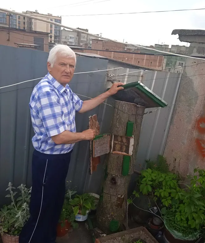 «Коли чуємо слово «пасіка», одразу уявляємо багато вуликів у квітучому садку чи в полі серед різнотрав’я. Картинка – ніби з казки. А мій співрозмовник Юрій Мещеряков із Луцька вирішив її осучаснити. Переселив вулики на дах 9-поверхового будинку, де живе. Зробив там справжню зону відпочинку. Навколо цвітуть вазони, гудуть бджоли, витає аромат прополісу – і все це височіє над вулицею, де мчать машини. Чим не казка?» – пише авторка.