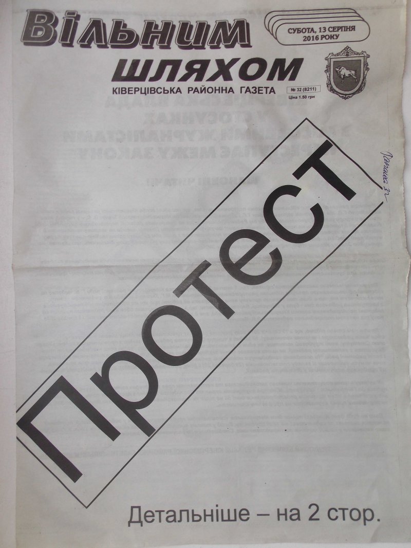 На знак протесту «Вільним шляхом» 13 серпня ц. р. вийшов із білими шпальтами, і – з поясненням причин таких дій… Крім того, колектив редакції звернувся до міністра внутрішніх справ Арсена Авакова, Генерального прокурора Юрія Луценка і Президента України Петра Порошенка з проханням припинити свавілля місцевої влади в особі голови райради Григорія Недопада, його заступниці Тамари Чигрин і потуранні їм із боку голови райдержадміністрації Валерія Ткачука…