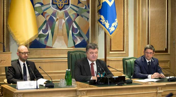 На фото прес-служби Президента України: під час нарад із керівниками виконавчої влади регіонів – Арсеній Яценюк, Петро Порошенко і Віталій Ковальчук.