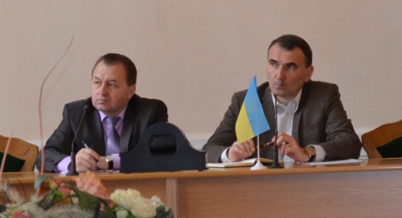 На фото Романа УСТИМЧУКА: Григорій Пустовіт і Олександр Мартинюк під час зустрічі з журналістами в овальному залі органів влади Волині.
