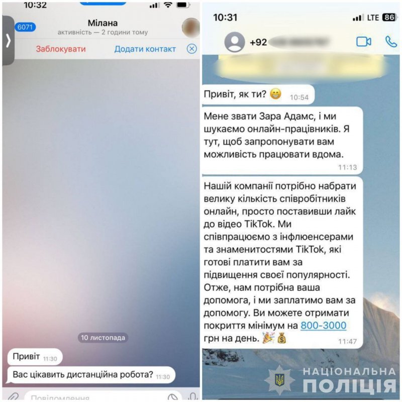 Поліція вкотре наголошує та застерігає, якщо до вас звернулися із схожими пропозиціями онлайн заробітків через різні месенджери, із закордонних номерів, де перші цифри +1 (913), +92 тощо, знайте – це шахраї. Ви не заробите грошей від перегляду відео, «лайків» та коментарів, лише втратите. Будьте обережні, бережіть себе та свої гроші.