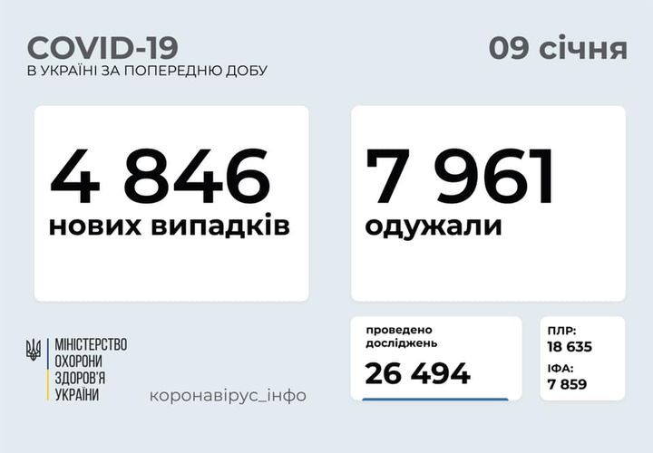 В Україні протягом доби підтвердили 4846 випадків коронавірусної інфекції COVID-19. Про це повідомив міністр охорони здоров’я Максим Степанов у Facebook 9 січня.