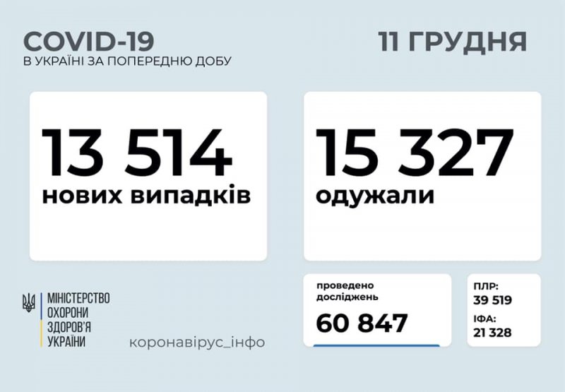 13 514 нових випадків коронавірусної хвороби COVID-19 зафіксовано в Україні станом на 11 грудня 2020 року. Зокрема, захворіли 638 дітей та 690 медпрацівників.