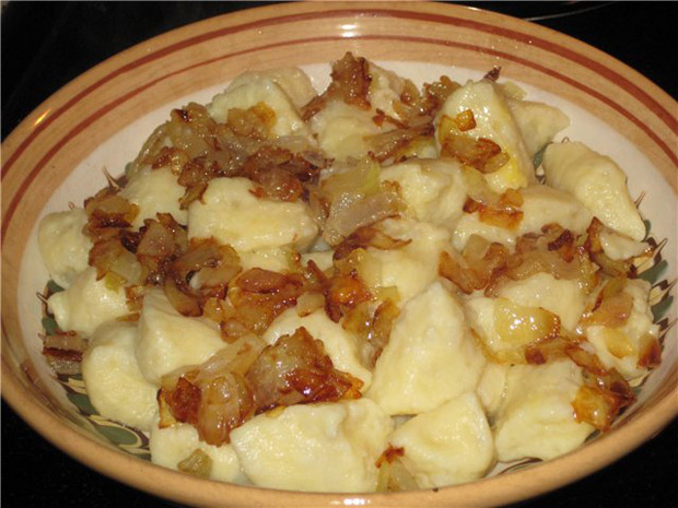на тарілку галушки, посипати їх смаженою цибулею, а навколо розкласти смажений