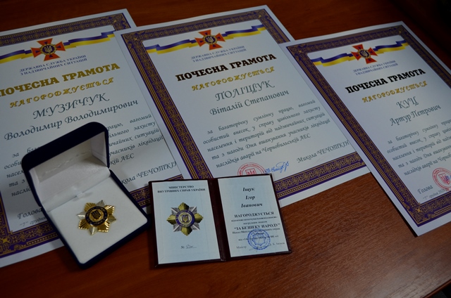 За багаторічну сумлінну працю, вагомий особистий внесок у справу цивільного захисту населення і територій від надзвичайних ситуацій та з нагоди Дня вшанування учасників ліквідації наслідків аварії на Чорнобильській АЕС почесними грамотами ДСНС України нагороджені Артур Куц, Володимир Музичук та Віталій Поліщук.