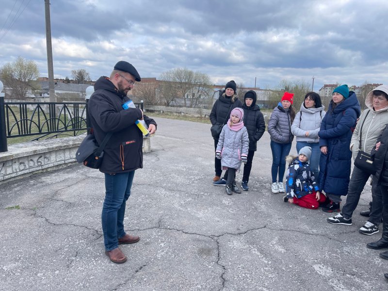 На фото пресслужби Ковельської міськради: Андрій Павляшик проводить екскурсію Ковелем для біженців та місцевих