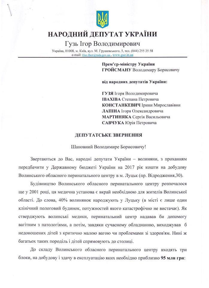 депутатів від Волині до глави КМУ Володимира Гройсмана.