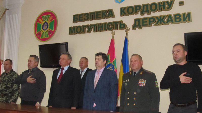 Тарас Пустовіт виконує гімн ліворуч від екс-командира Луцького прикордонного