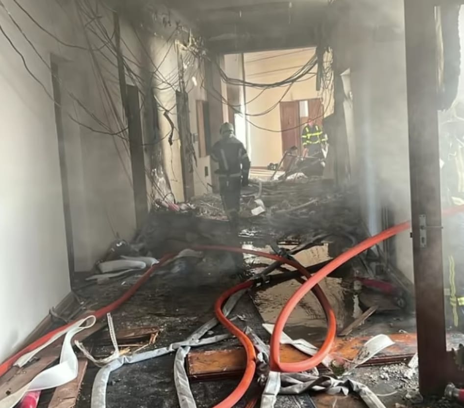На фото пресслужби ДСНС: зовнішній вигляд пошкодженої урядової будівлі і робота пожежників усередині споруди.