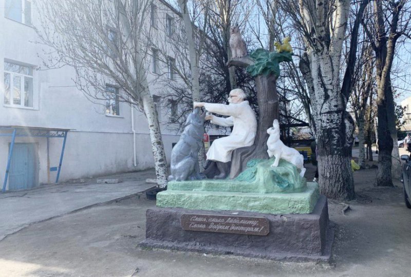 фото з порталу «Рубрика»: скульптура Айболита та звірят на території однієї з райлікарень в Україні.