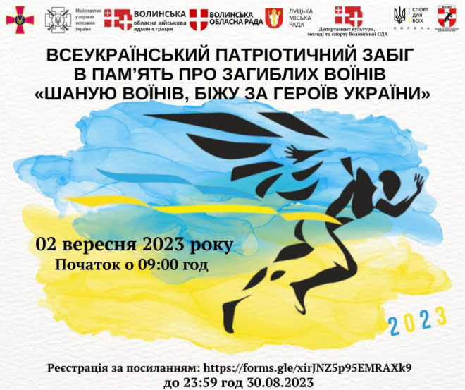 2 вересня (субота) 2023 року на Волині відбудеться шостий Всеукраїнський забіг «Шаную воїнів, біжу за Героїв України».