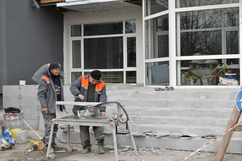 спорткомплекс ззовні, а в приміщенні, де розміщений басейн – стіни обклали